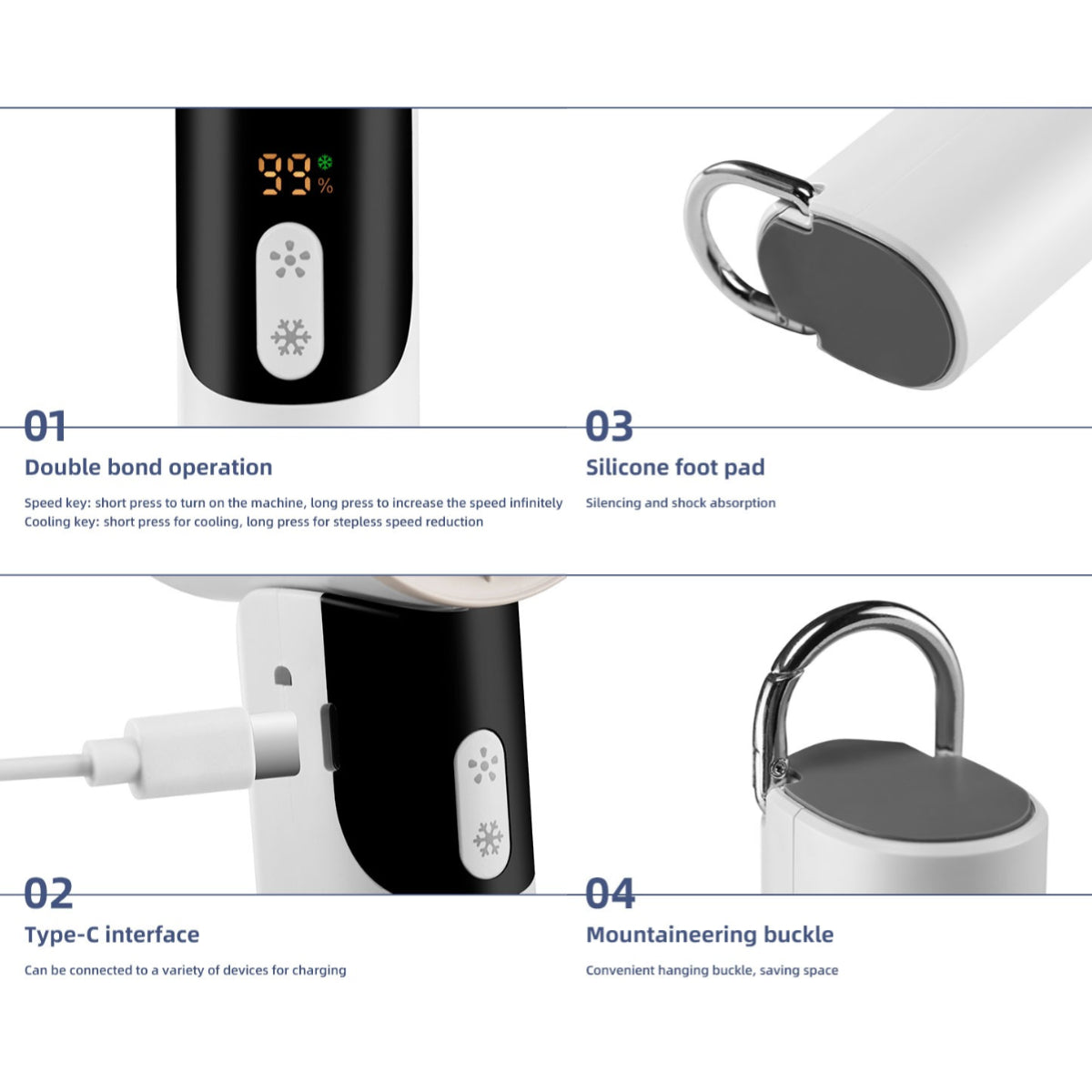 3. 13,000 rpm high-speed brushless motor, powerful wind with low noise, auto-rebound climbing clip, neck-hanging design for hands-free use;