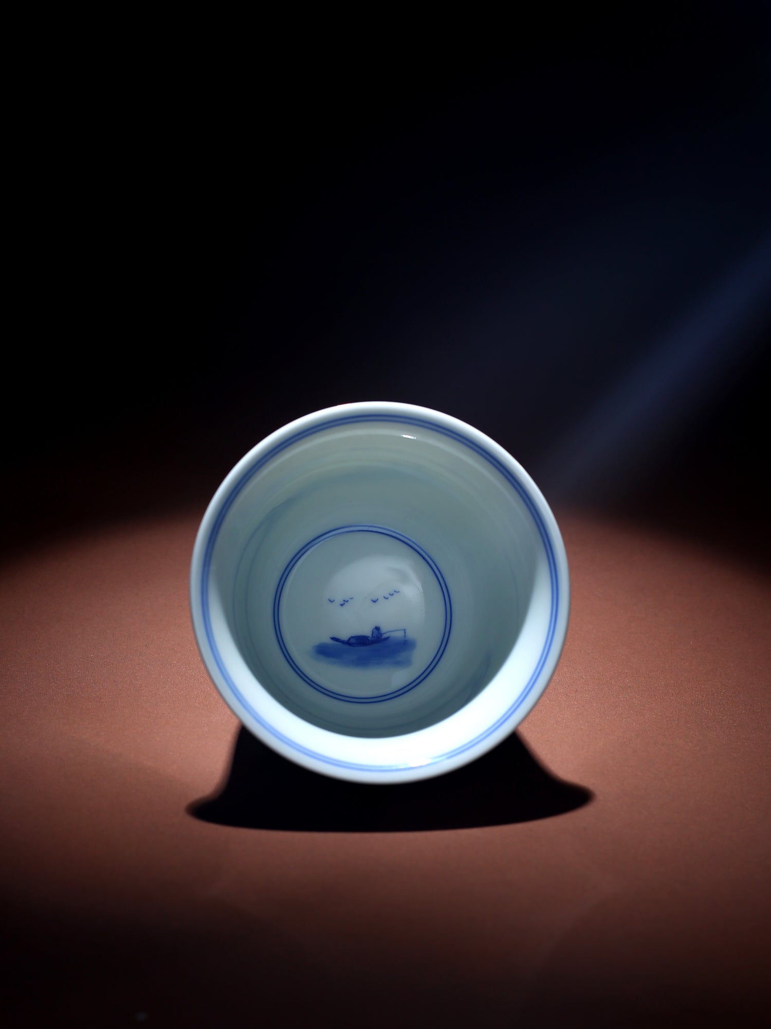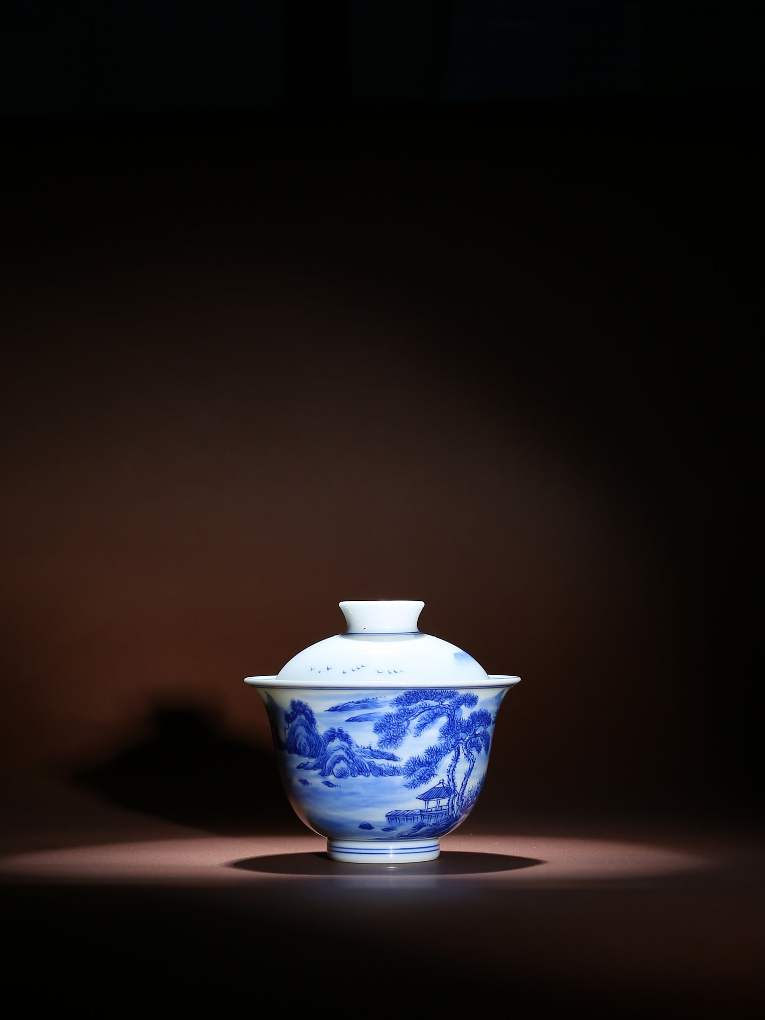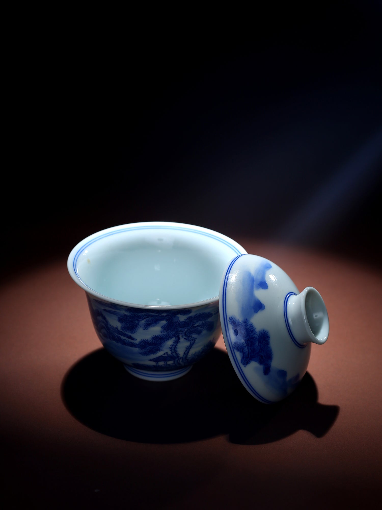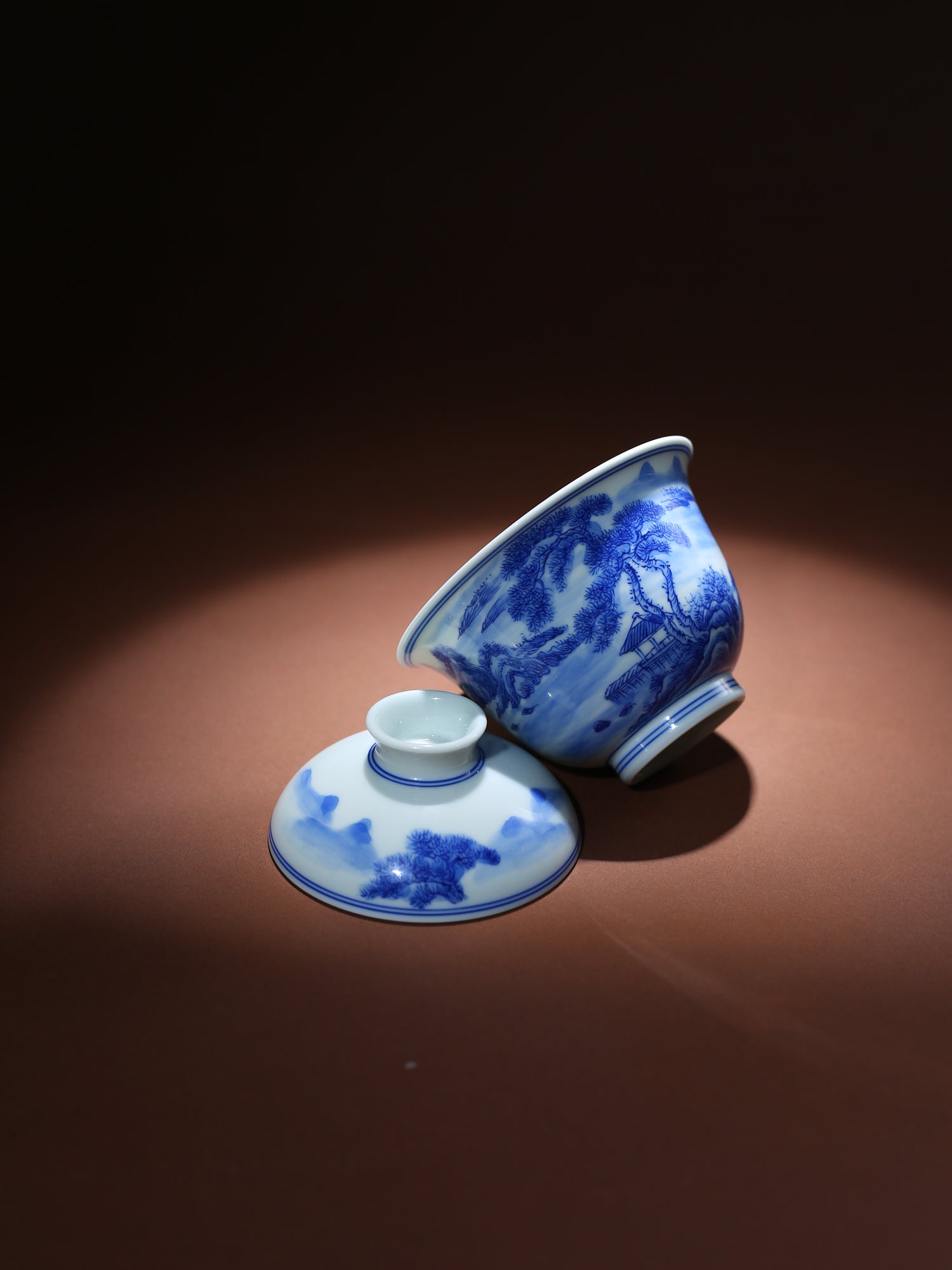 Oriday 手描き青花山水柄蓋付き茶碗 小型カンフー陶器茶器セット 岩茶用主人杯としておすすめ