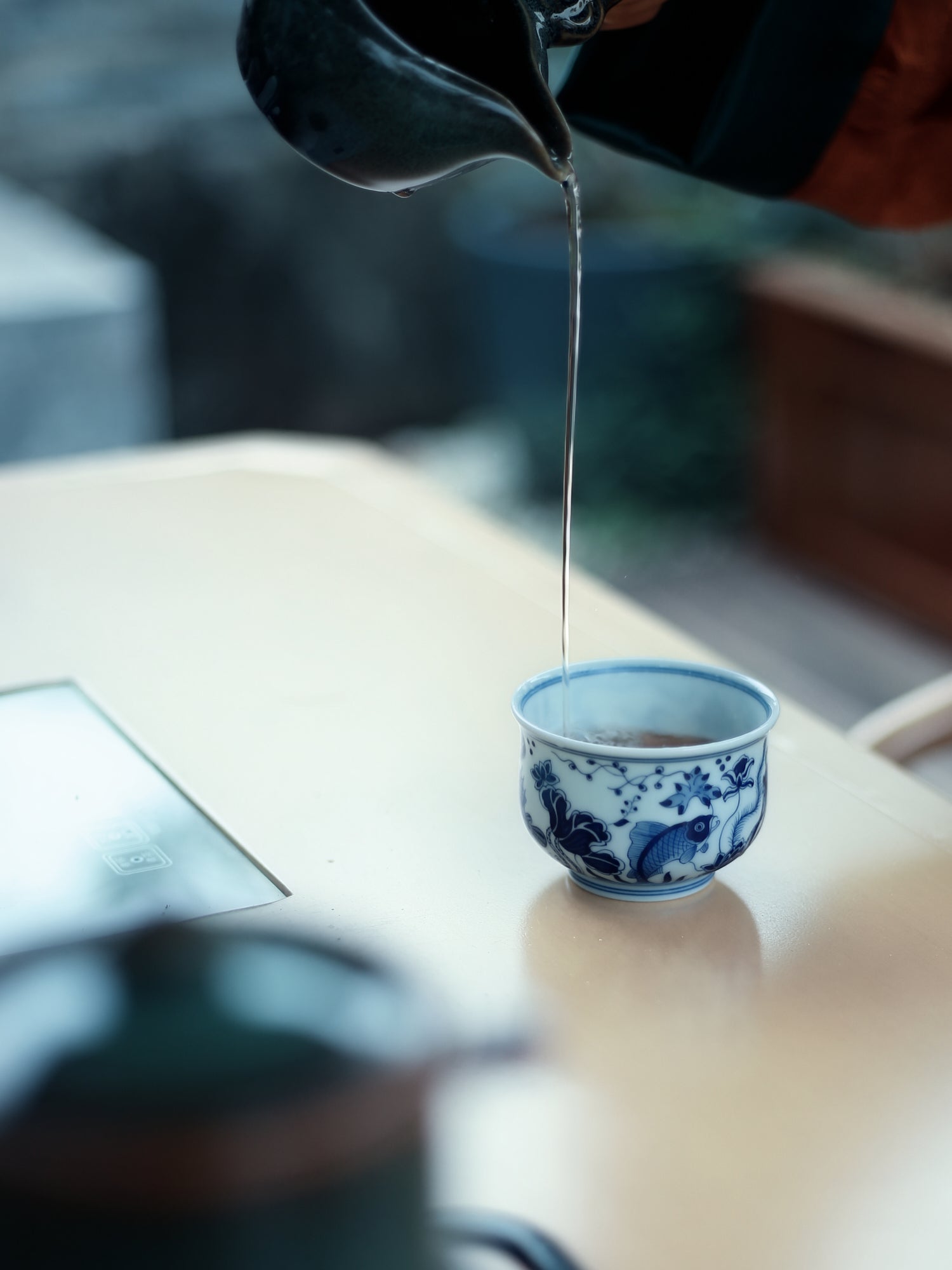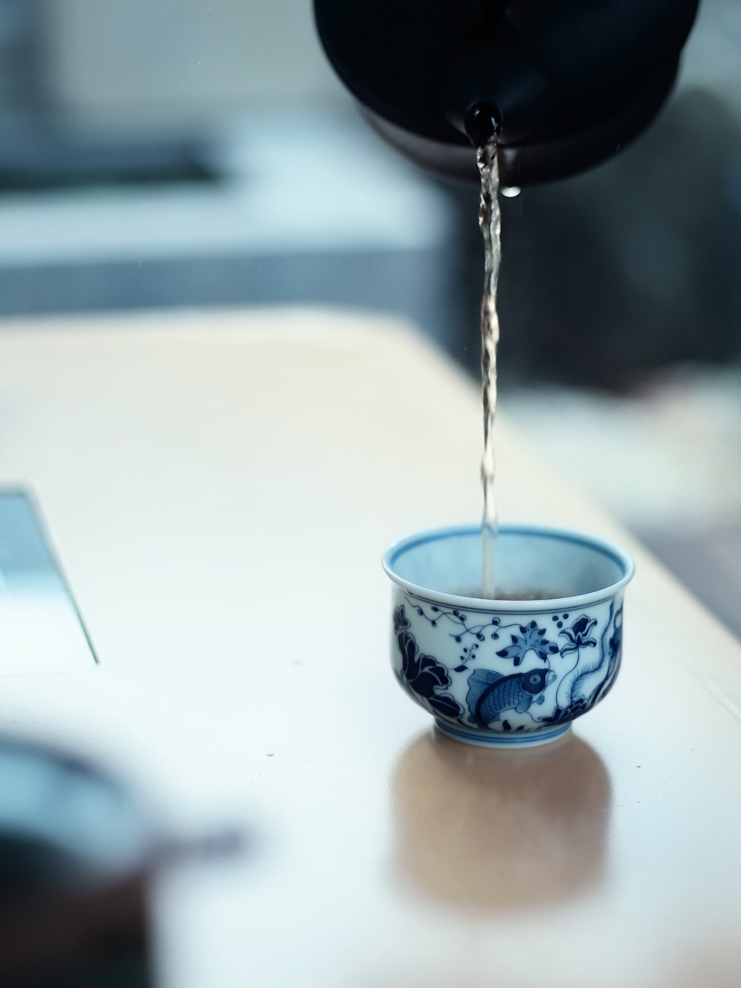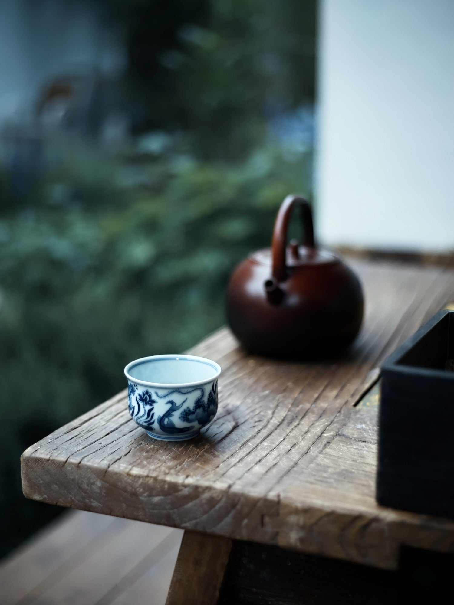 · 青花の美しい器は、お茶のある暮らしに趣を添える。