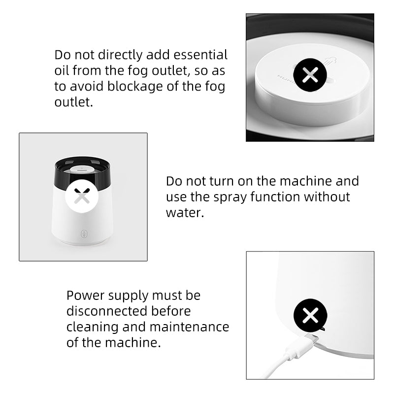 4、缺水狀態:長按觸摸按鍵可開啓燈光效果,單擊觸摸按鍵開啓噴霧開啓噴霧會發出報警聲音三次,燈光也會一起關閉。