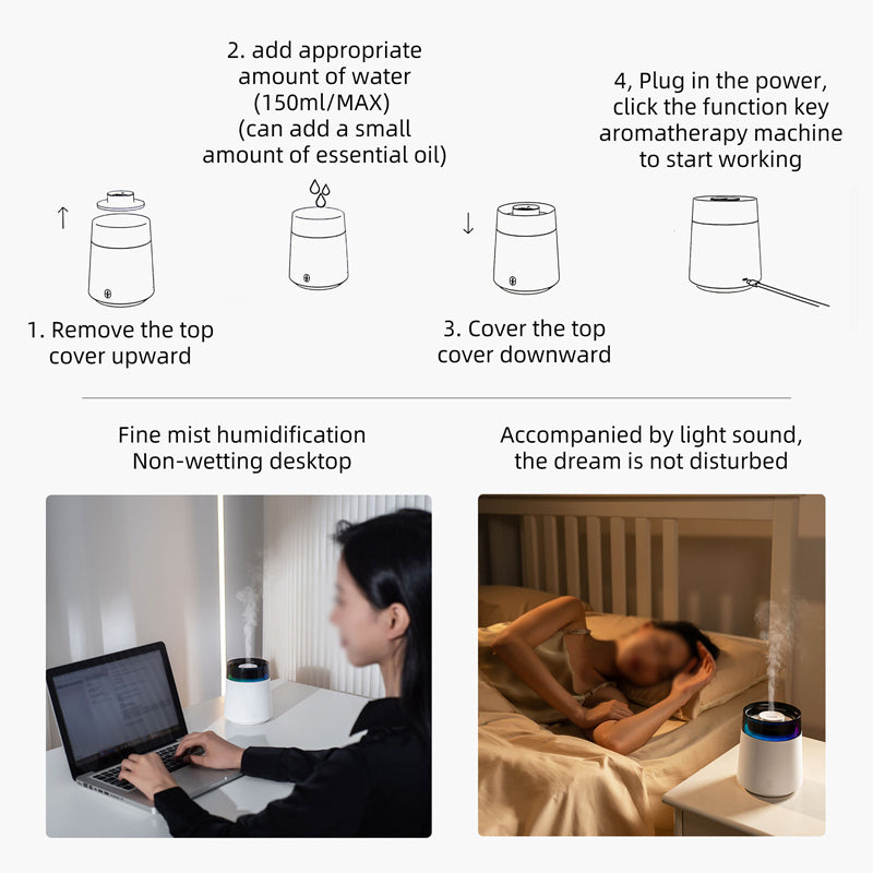 1、霧化細膩,水潤不濕桌,觸摸按鍵,霧化燈光分開操作,簡單便攜;
